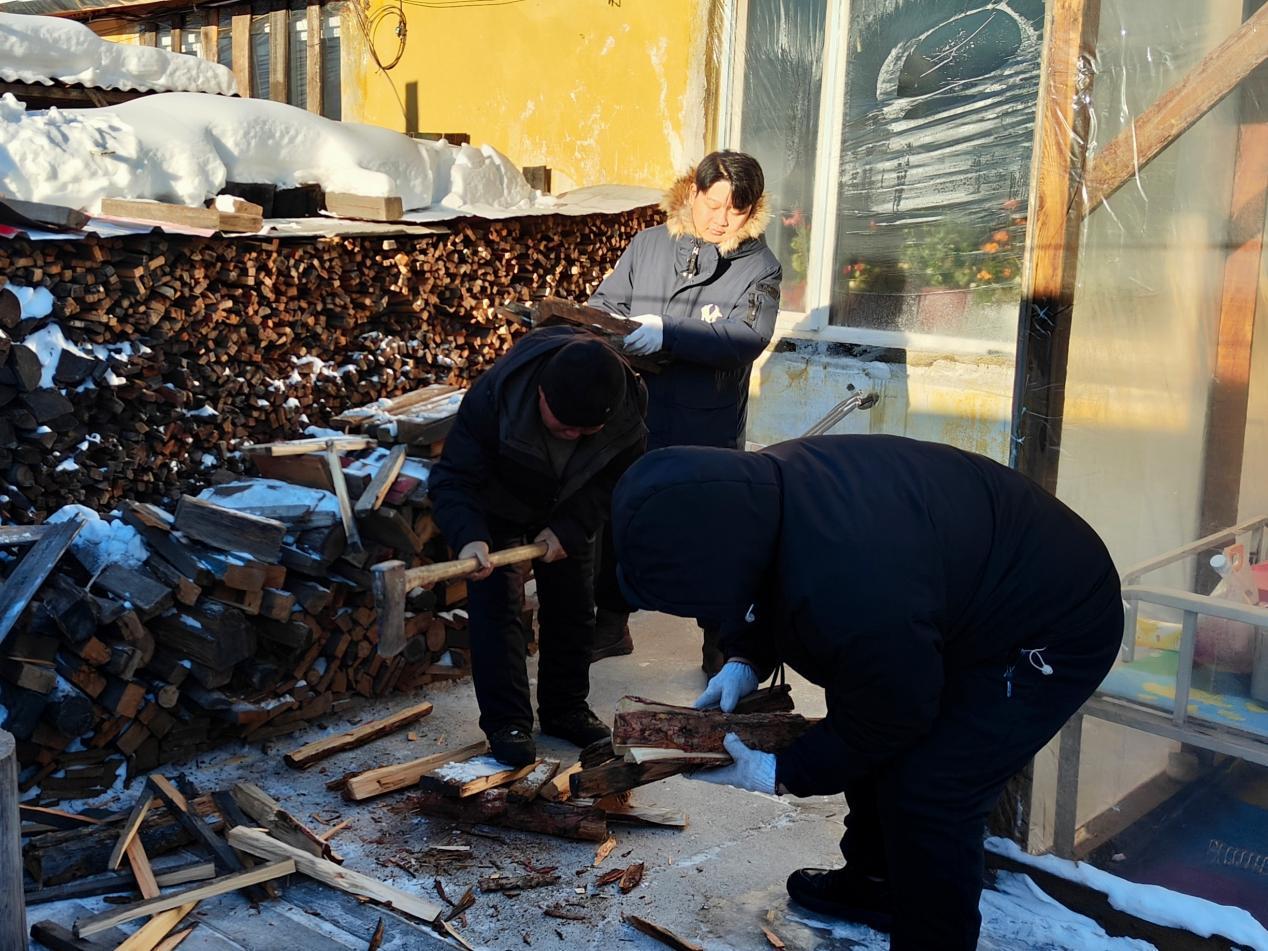 林場(chǎng)黨員先鋒隊(duì)隊(duì)員幫助困難職工準(zhǔn)備取暖燒柴(陶文玲 攝)