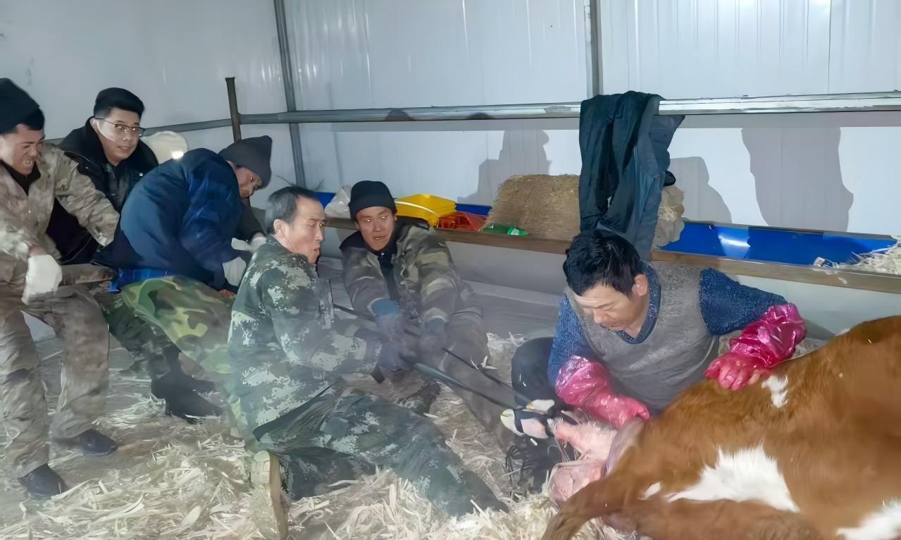 趕到牛棚時,發(fā)現(xiàn)一頭棕白花母牛臥在干草堆上,四肢抽搐,腹部劇烈起伏卻始終無法完成生產(chǎn)。 “別急,我們現(xiàn)在應(yīng)該利用助產(chǎn)工具,現(xiàn)在必須立刻進(jìn)行人工助產(chǎn)拖拽!” 民警一邊安撫養(yǎng)殖戶的情緒,一邊分工協(xié)作。兩個小時后,隨著母牛一聲響亮的低吼,在眾人的合力幫助下 ,小牛犢成功降生。