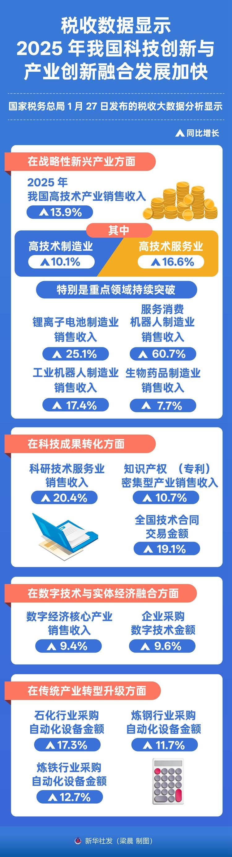 新華社北京1月27日電(記者劉開雄)國家稅務總局1月27日發(fā)布的稅收大數(shù)據(jù)分析顯示,2025年,我國科技創(chuàng)新與產(chǎn)業(yè)創(chuàng)新融合發(fā)展加快,戰(zhàn)略性新興產(chǎn)業(yè)茁壯成長,科技成果轉(zhuǎn)化力度持續(xù)提升,數(shù)字技術(shù)與實體經(jīng)濟融合加深,傳統(tǒng)產(chǎn)業(yè)轉(zhuǎn)型升級加快。