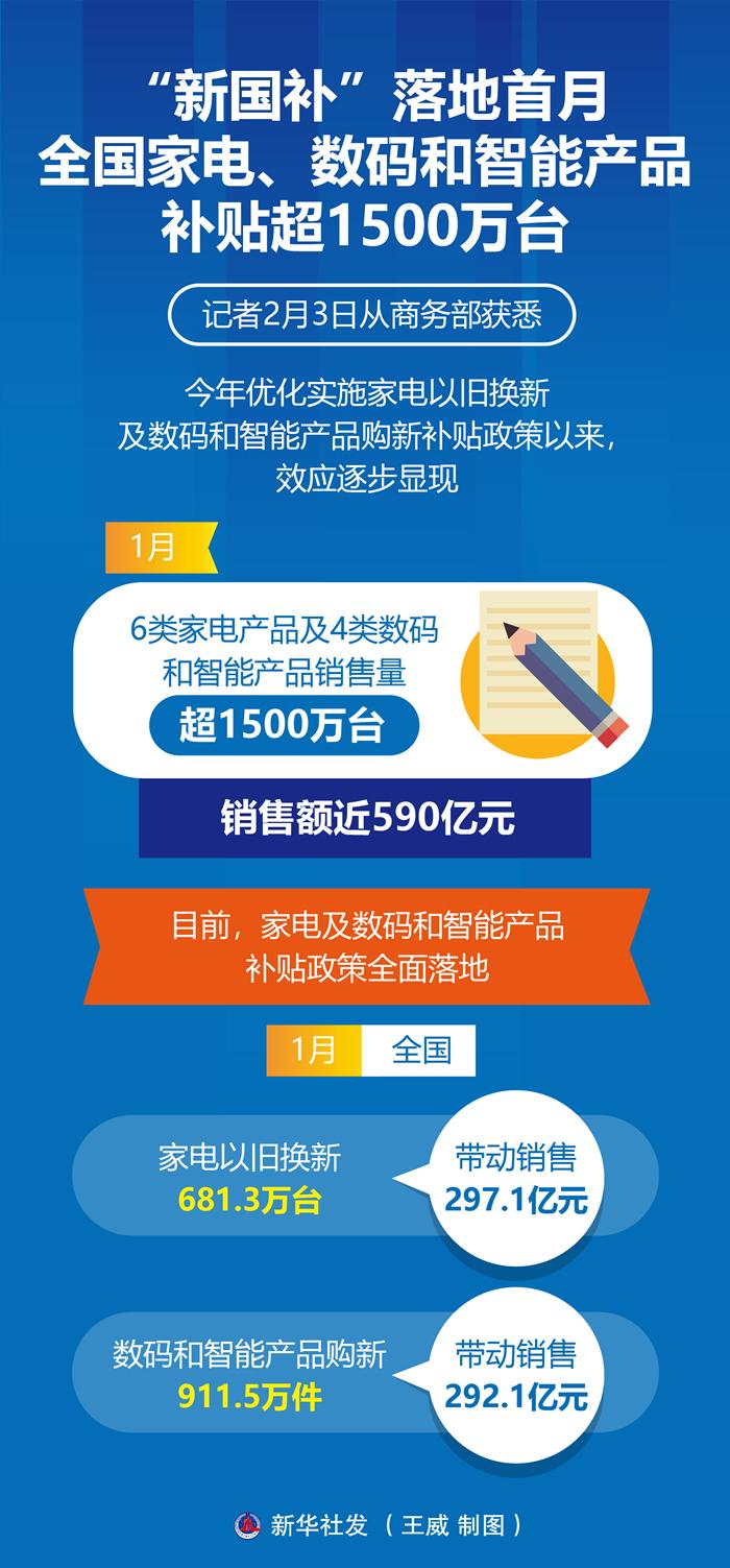 記者2月3日從商務(wù)部獲悉,今年優(yōu)化實(shí)施家電以舊換新及數(shù)碼和智能產(chǎn)品購(gòu)新補(bǔ)貼政策以來(lái),效應(yīng)逐步顯現(xiàn)。1月,6類家電產(chǎn)品及4類數(shù)碼和智能產(chǎn)品銷售量超1500萬(wàn)臺(tái),銷售額近590億元。