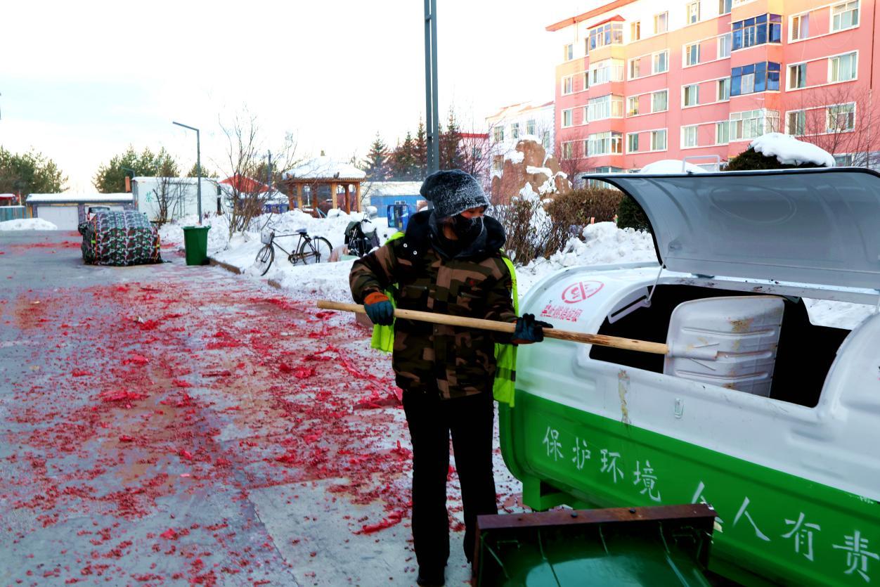 2月16日8點,大街小巷年味正濃,鞭炮紙屑散落各處,行人寥寥。身穿黃馬甲的林業(yè)局環(huán)衛(wèi)工人已穿梭在街頭,帽子、睫毛凝滿白霜,手中掃帚不停揮舞,將鞭炮碎屑、生活垃圾及時清掃歸堆、裝車清運(yùn)。轉(zhuǎn)崗環(huán)衛(wèi)工人馬建民說:“我的責(zé)任區(qū)內(nèi)商戶多、居民多,春節(jié)期間工作量比平時多一倍,必須打掃干凈,讓大家過個舒心年?!痹谌w保潔員的奮戰(zhàn)下,居民區(qū)實現(xiàn)鞭炮紙屑隨放隨清、生活垃圾日產(chǎn)日清,大街小巷始終整潔有序。
