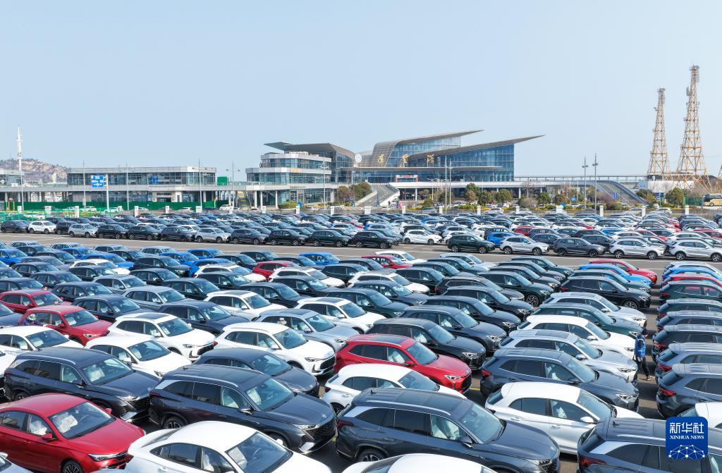 ??3月10日拍攝的江蘇省連云港港出口汽車堆場(chǎng)(無(wú)人機(jī)照片)。新華社發(fā)(王健民攝)