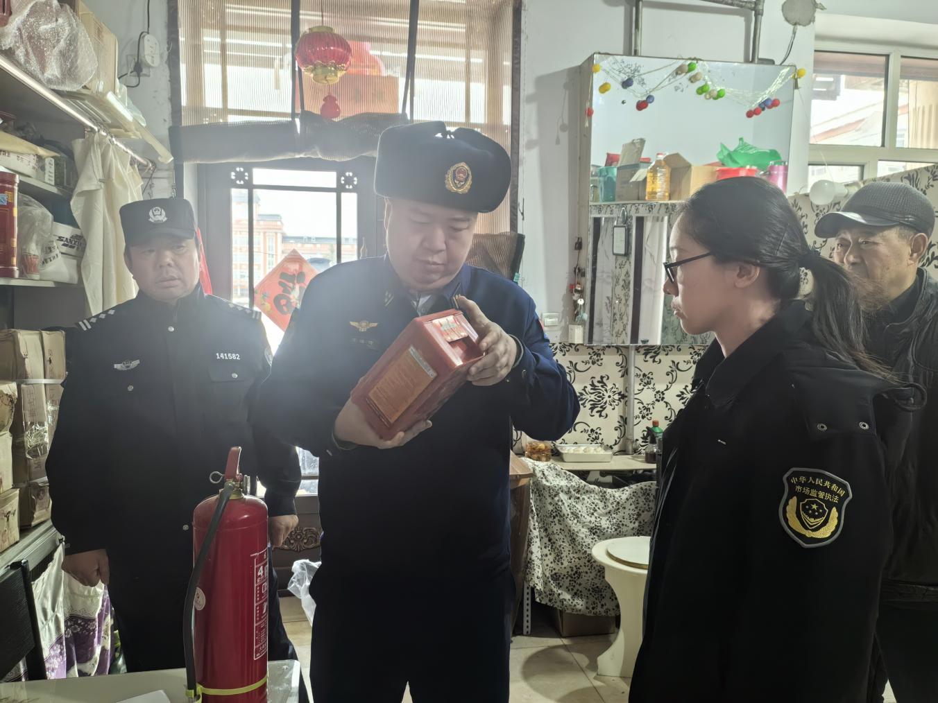 檢查組在消防器材銷售門店核對(duì)產(chǎn)品外觀標(biāo)識(shí)、構(gòu)件、廠家資質(zhì)等檢查和判定(胡春磊 攝)
