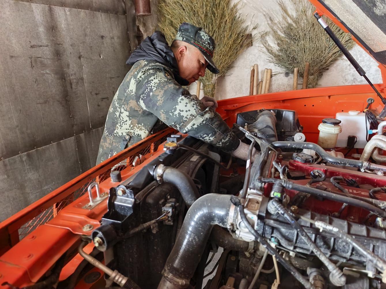 林場技術(shù)人員正在檢修維護(hù)防火車輛(柏松 攝)