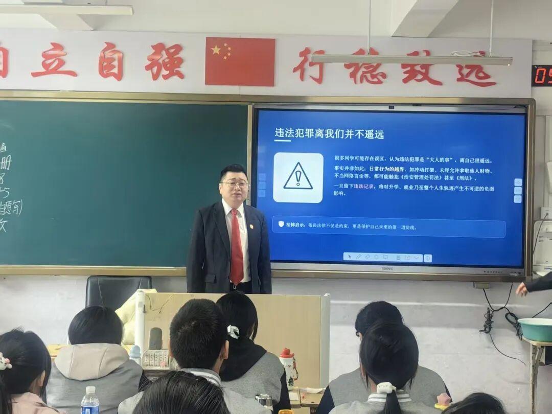 深入班級,互動答疑解惑。集中宣講結(jié)束后,趙世奇走進各班級,開展小范圍、針對性更強的法治輔導(dǎo)。根據(jù)不同班級學(xué)生的年齡特點以及日常相處中暴露出的微小矛盾、行為偏差,進行“點對點”法律指導(dǎo)。在班級課堂上與學(xué)生近距離圍坐交流,耐心解答學(xué)生提出的法律疑問,并結(jié)合班級實際發(fā)生的典型小事,將法律知識細化到學(xué)習(xí)生活的具體場景中。這種面對面、心貼心的互動方式,讓法治教育更加鮮活、可感,真正實現(xiàn)了普法宣傳全覆蓋、無死角。