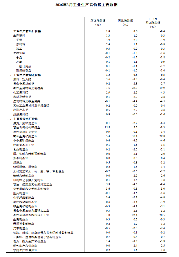2026年3月份,全國工業(yè)生產(chǎn)者出廠價(jià)格同比由上月下降0.9%轉(zhuǎn)為上漲0.5%;環(huán)比上漲1.0%,漲幅比上月擴(kuò)大0.6個(gè)百分點(diǎn)。工業(yè)生產(chǎn)者購進(jìn)價(jià)格同比由上月下降0.7%轉(zhuǎn)為上漲0.8%;環(huán)比上漲1.2%,漲幅比上月擴(kuò)大0.5個(gè)百分點(diǎn)。一季度,工業(yè)生產(chǎn)者出廠價(jià)格比上年同期下降0.6%,工業(yè)生產(chǎn)者購進(jìn)價(jià)格下降0.5%。